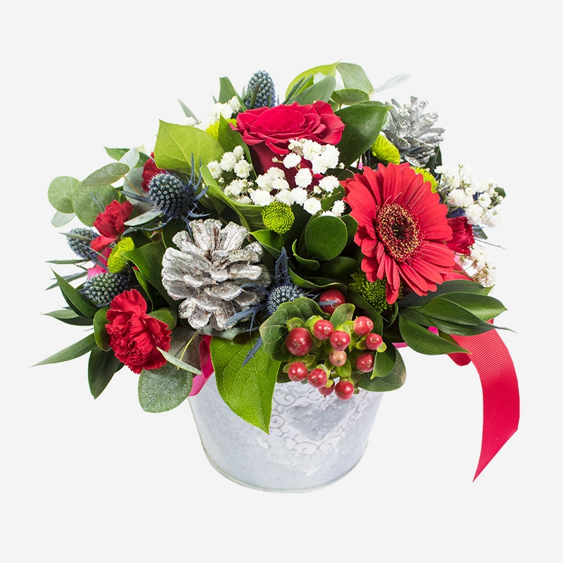 A wonderful Christmas gift to send to family, friends, loved ones or colleagues this Christmas. Creatively crafted and delivered by a professional local florist - the arrangement will feature a florist choice selection of flowers including Hypericum, Carnations, Gypsophila, Red Germini, a Rose and more.