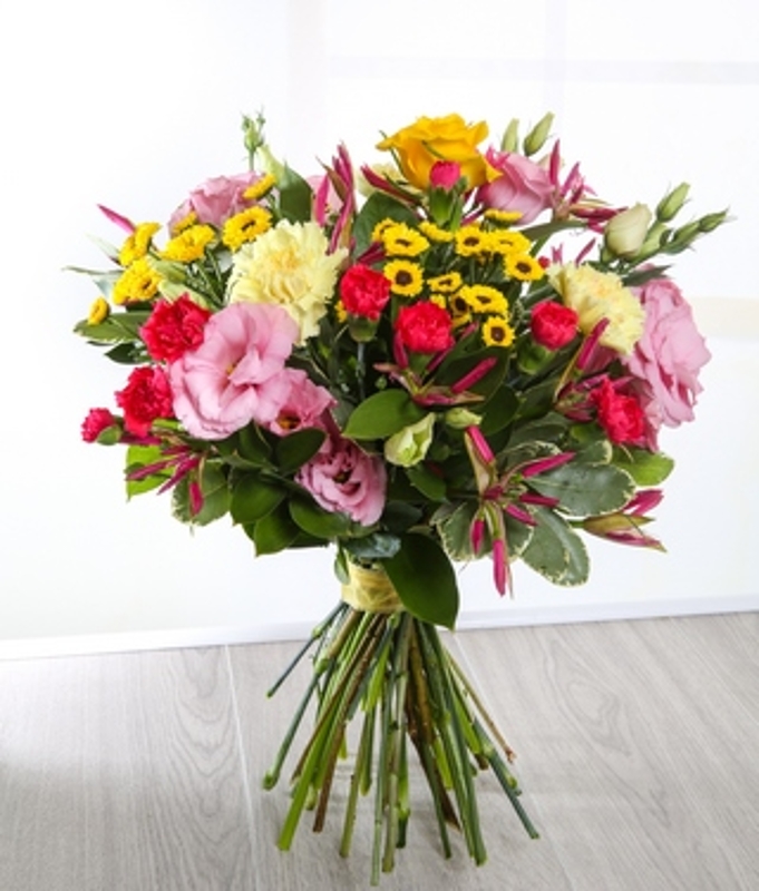 Pretty pastel petals are offset with vibrant blooms in our Luella bouquet. Using a combination of fresh flowers including Lisianthus, Roses, Carnations and Santini.